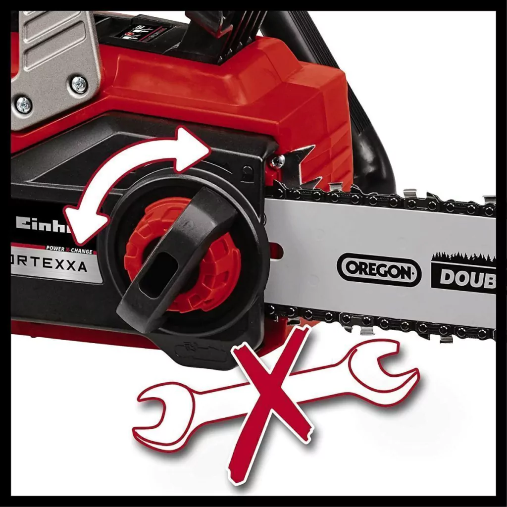 La motosierra con batería FORTEXXA 18/30 de Einhell es un potente miembro de la flexible familia Power X-Change. Como ayudante perfecto en trabajos en madera en árboles frutales densamente ramificados y densos árboles caducifolios y perennifolios, la FORTEXXA se acciona por un motor sin escobillas de Einhell, un motor eléctrico sin escobillas más potente y duradero que un motor con escobillas convencional. Junto con la espada y cadena de calidad OREGON, las ramas gruesas apenas tienen algo que oponer a la FORTEXXA. Para los trabajos con madera industrial y escuadrada así como leña también se obtienen los mejores resultados con la versión con batería de una motosierra. Una tensión de cadena ajustable sin herramientas y un cambio de cadena sencillo facilitan la manipulación. El receptor de cadena y la protección antirretroceso con freno inmediato de la cadena aportan la seguridad durante el uso y la lubricación automática de la cadena a través de una gran abertura de llenado de aceite para el cuidado sencillo. El robusto tope de garras está hecho de metal, el asa ergonómica está equipada con agarre suave para el sostén firme y seguro. Para el funcionamiento se necesita una batería de 18 V Power X-Change. La innovadora serie Power X-Change sobresale por su gran potencia y máxima flexibilidad: las baterías de iones de litio se pueden intercambiar entre los equipos de esta serie de Einhell. Cada sistema de baterías puede utilizarse con cada equipo Power X-Change. La velocidad de cadena es adaptable según la aplicación, es decir, puede conmutarse entre plena potencia (8 m/s) y modo ECO (6 m/s). Con velocidad de cadena reducida se alarga la duración de la batería. El envío se realiza sin batería ni cargador, estos son adquiribles por separado, por ejemplo, como un práctico set para principiantes.